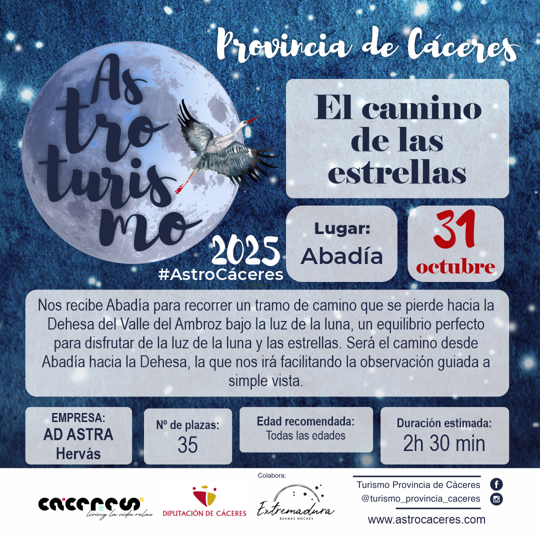 Nos recibirá Abadía para recorrer un tramo de camino que se pierde hacia la dehesa del Valle del Ambroz, un equilibrio perfecto para disfrutar de la luz de la luna y las estrellas. Será este camino, el que nos irá facilitando la observación guiada a simple vista.